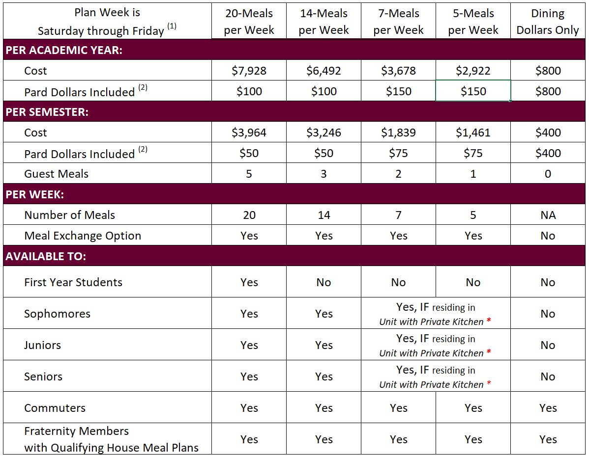 (1) Plans begin at dinner the Saturday afternoon prior to the scheduled start of classes and end at dinner on the scheduled last day of final exams. Modified service is provided during Fall, Thanksgiving, and Spring break days.
